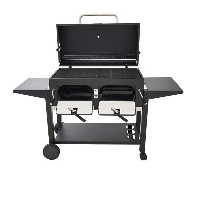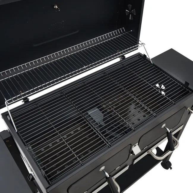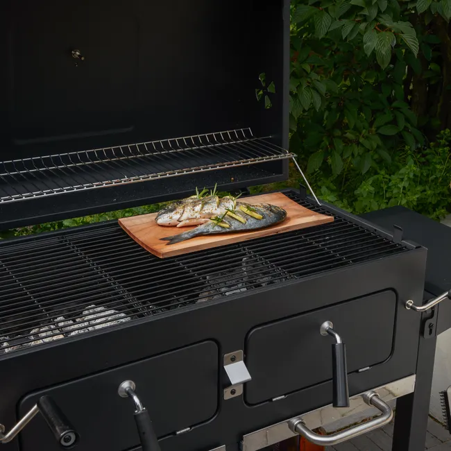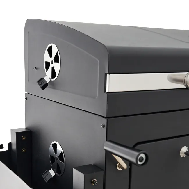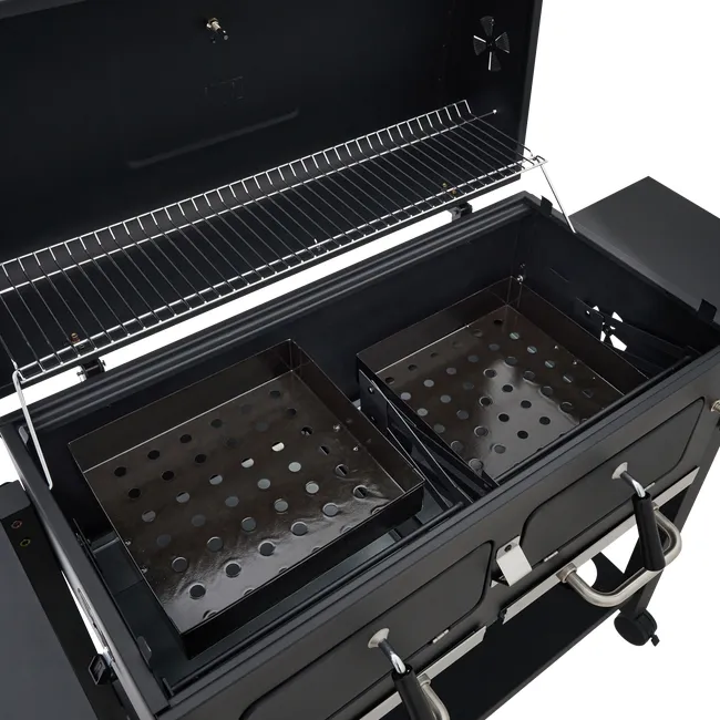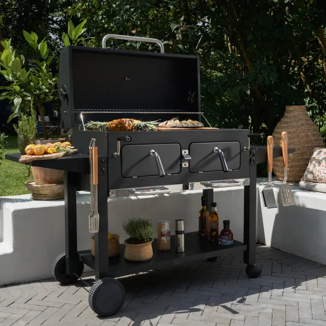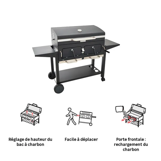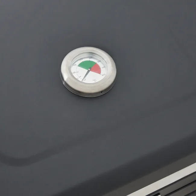 Perfeito para cozinhar para 12 a 15 pessoas, este barbecue tem uma grande superfície de cozedura de 82,5 x 41,5 cm, distribuída por três grelhas independentes. Pode ser utilizado como fumeiro graças à sua tampa fechada e o seu termómetro integrado garante um melhor controlo da temperatura. Com aberturas na tampa e na taça para uma melhor circulação do ar, inclui também uma grelha de aquecimento articulada para evitar que os alimentos caiam.