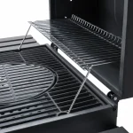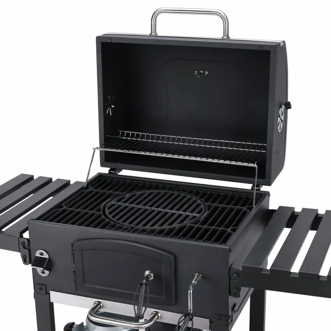 Vantagens do produto Tampa e tanque equipados com arejadores Altura ajustável da bandeja do carvão Duas prateleiras laterais com ganchos Um abridor de garrafas integrado! Esta churrasqueira pode ser usada no modo de fumar ou churrasco tradicional. Graças aos seus 4 aeradores, acende-se rapidamente. Estes aeradores ventilam as brasas para permitir que o ar circule facilmente. Encontrá-los-á de ambos os lados do tanque e da tampa. Uma manivela permite-lhe ajustar a altura da panela de aço para variar a temperatura de acordo com as suas necessidades. O termómetro na tampa permite controlar a temperatura. Este produto de aço robusto e de alta qualidade é revestido com uma tinta de esmalte resistente ao calor. 3 grelhas esmaltadas, uma das quais redonda e amovível, são fornecidas com o barbecue, bem como uma protecção térmica cromada. A abertura na frente permite carregar o carvão. Fabricado em aço de alta qualidade com tinta resistente ao calor Abertura frontal com pega para carregar o carvão vegetal Tabuleiro de carvão de aço ajustável por meio de uma manivela Termómetro na tampa Grelhas: 3 grelhas de ferro fundido esmaltado, 1 das quais é amovível Protecção térmica cromada Prateleiras: 2 laterais, de aço e dobráveis, equipadas com 4 ganchos 1 prateleira inferior Ventiladores : 4, 2 de cada lado da tigela e tampa Pegas: 2, aço inoxidável para tampa e cinzeiro Apanhador de cinzas removível Abridor de garrafas integrado Rodas: 2 Churrasqueira completa com prateleiras estendidas : L122xD65xA103,5cm / com prateleiras dobradas : L82xD65xH103.5cm Superfície de cozedura: W 58cm x D 42cm incluindo grelha central removível de 31,2cm de diâmetro / Altura da grelha: 81cm Manter quente: W54 x D20 Tabuleiro de carvão vegetal: W 48,5cm x D 30 x H 6cm A grelha central de cozedura pode ser substituída por outra grelha ou plancha de 31cm de diâmetro (não fornecida). Contudo, não garantimos a compatibilidade com este. AVISO! Não use gasolina para acender ou reacender