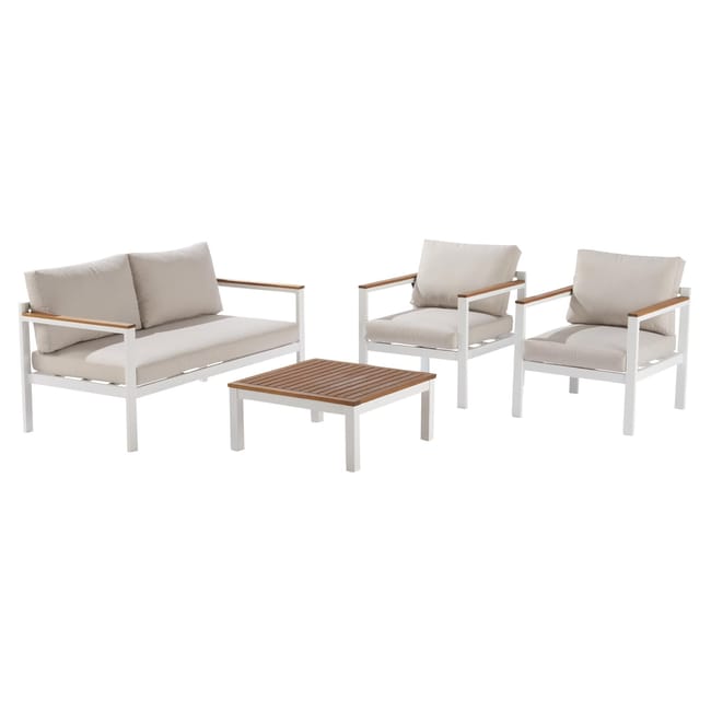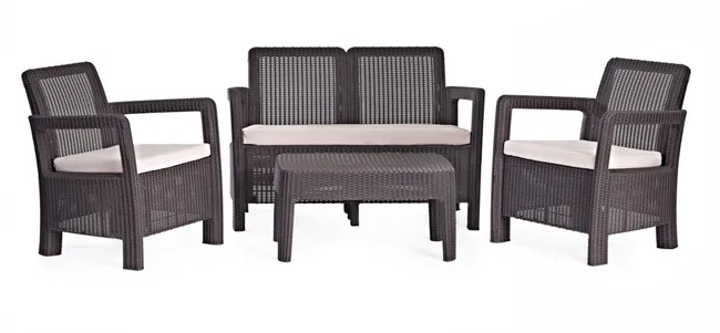 Conjunto de jardim relax NATERIAL, ideal para varanda, terraço ou jardim. Constituído por uma mesa (50X40cm), 2 cadeirões (74X79X66cm) e um sofá de 2 lugares (132X79X66cm). Em resina injectada, polipropileno cinzento grafite, sendo estes materiais leves fáceis de mover e resistentes às intempéries, não enferrujando. Com este set são poupadas cerca de 700 toneladas de plástico por ano. 60% da estrutura efectuada com coberturas de estufas de plástico. Poupança dos recursos naturais e reciclagem de produtos poluentes.