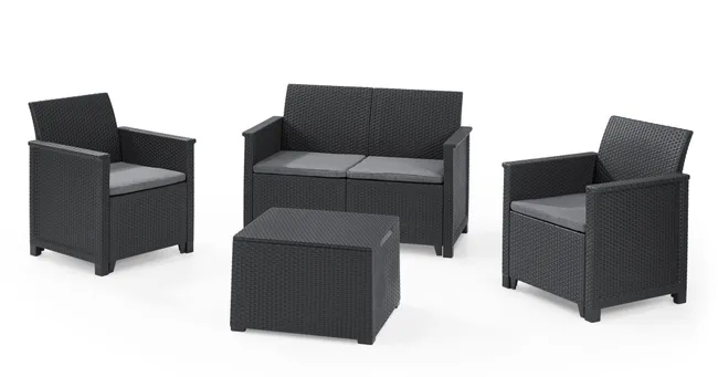– Conjunto muito prático e fácil de montar – Totalmente em resina – incluindo encaixes – o que dispensa qualquer manutenção, quer faça sol ou chuva, evitando assim manchas e bolor – Mesa de centro que também serve como caixa de arrumação – ideal para guardar as almofadas