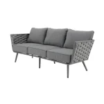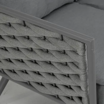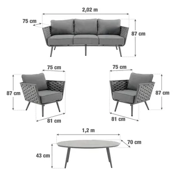 Adote o mobiliário baixo de jardim Nilo para a sua varanda ou jardim! Composto por um sofá, duas poltronas individuais e uma mesa de centro, recebe até 5 pessoas em um ambiente moderno e aconchegante com sua tecelagem de náilon. O conforto da sua sala de estar ao ar livre O salão baixo do jardim Nilo pode acomodar até 5 pessoas para um lanche em família ou um aperitivo com amigos. Está equipado com almofadas grossas que oferecem um importante conforto de assento. As almofadas são feitas de poliéster e são resistentes aos raios UV e repelentes à água para retardar o desbotamento e permitir a limpeza imediata de manchas acidentais. O sofá e as poltronas possuem uma elegante capa de largas tiras de náilon, que lembra a estética dos sofás de interior. Além do visual contemporâneo, esse material é durável e robusto: é resistente às variações climáticas e também à abrasão. A estrutura de todos os elementos do conjunto é em alumínio, um material durável, leve e resistente que resiste à humidade e à ferrugem. Um conjunto moderno e elegante Monocromático, sua cor cinza escuro reforça seu visual contemporâneo. Cada peça de mobiliário tem quatro pernas tubulares de alumínio delgadas que se inclinam ligeiramente para fora para uma aparência elegante. Combine-o com a Pergola Manea para um espaço de relaxamento harmonioso. Dicas de manutenção Ideal para uso diário, o conjunto Nilo requer pouca manutenção. Recomenda-se prepará-lo para o inverno sob uma capa respirável Naterial durante longos períodos de não utilização. Da mesma forma, as almofadas são totalmente removíveis e devem ser protegidas da humidade quando não estiverem em uso. O alumínio pode ser facilmente limpo com pano úmido e produto neutro.