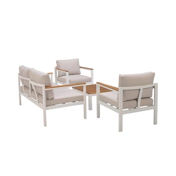 Desfrute de um agradável momento ao ar livre instalado nos móveis de jardim da série Oris. Um mobiliário de jardim completo Composto por um sofá de 2 jogos, 2 poltronas individuais e uma mesa de café, este mobiliário completo do jardim transformará seu jardim em um casulo externo real, para receber os vizinhos para um café. Projetado para conforto ideal, as almofadas presentes no encosto e no assento das poltronas e o sofá garantem que você fique confortável por longas horas. Eles foram submetidos a tratamento anti-UV e repelente de água, para desacelerar sua descoloração e permitir que você apodreça imediatamente tarefas acidentais. Sua mesa central permite que todos os hóspedes coloquem sua bebida lá à mão. Um estilo natural e contemporâneo Com suas formas angulares, os móveis baixos do Jardim Oris têm uma aparência moderna, reforçada pela presença de alumínio. Esse material leve e durável é uma garantia de resistência à umidade e ferrugem. O lado natural trazido por Eucalyptus Wood, do manejo florestal ecológico, suaviza o todo para um resultado elegante. Para aproveitar mais os dias de verão, associe -o ao banhos de sol Oris. Dicas de manutenção Para alimentar a madeira de eucalipto, é recomendável usar o óleo de teca ou linho anualmente. Para evitar inconvenientes na madeira, é aconselhável o inverno sob uma capa respirável, o que permitirá que a madeira tenha acesso ao ar externo necessário. Um nojento também pode ser aplicado a apoios de braços para preservar a cor da madeira. As almofadas são totalmente removíveis e podem ser lavadas na máquina, uma função de “lavagem a frio”. O alumínio é facilmente limpo: um pano úmido e um produto neutro são suficientes para trazê -lo de volta à vida. Durante todo