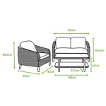 Desfrute de uma xícara de café no conforto do mobiliário baixo de jardim Odeon. Composto por um sofá de 2 lugares, duas poltronas individuais e uma mesa de centro, veste os seus espaços exteriores com um estilo boémio chique. Um conjunto acolhedor e prático Completo, o salão baixo com jardim Odeon acolhe 4 pessoas para um momento de convívio. As suas duas poltronas individuais e o seu sofá de 2 lugares oferecem um elevado nível de conforto que lhe dará vontade de prolongar as suas noites no terraço. As almofadas são acolhedoras e equipadas com efeito algodão, macias e agradáveis ao toque. Receberam um tratamento anti-UV e repelente à água para retardar o desbotamento e permitir a limpeza imediata de manchas acidentais. A mesa de centro é composta por duas bandejas para aumentar dez vezes o espaço disponível e garantir que você tenha tudo o que precisa para uma noite de sucesso. Para garantir a harmonia geral, todos os elementos do conjunto possuem imitação de rattan feito de resina de polietileno, material durável e resistente aos raios UV e à humidade. Projetada para garantir fácil manutenção e longa vida útil, a estrutura do Odeon é inteiramente feita de alumínio. Este material leve, combinado com ferragens de aço galvanizado, torna seu conjunto resistente à ferrugem e humidade. Linhas elegantes O conjunto Odeon oferece um charme autêntico e acolhedor ao seu terraço. Seu tecido inspirado no rattan traz uma suavidade boêmia à sua aparência geral. Seu design arredondado cria o efeito de uma bolha de relaxamento na qual você poderá relaxar. Para garantir a harmonia, um efeito madeira é estampado nas pernas das poltronas e da mesa. Complete o seu conjunto com o guarda-sol Aura branco. Dicas de manutenção Para preservar seu conjunto Odeon, recomendamos prepará-lo para o inverno em local livre de humidade ou protegê-lo com capa Naterial durante longos períodos de desuso. Da mesma forma, as almofadas são totalmente removíveis e devem ser protegidas da humidade quando não estiverem em uso. O alumínio pode ser facilmente limpo com pano úmido e produto neutro. As almofadas são acolhedoras e confortáveis, com um toque muito suave de “efeito algodão”. As almofadas são totalmente removíveis para fácil manutenção. Tecidos de poliéster, com tratamento anti-UV e hidrorrepelente, para resistir às intempéries