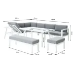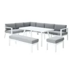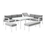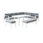 Com o seu alumínio branco, almofadas cinzentas e linhas retas, o conjunto de mobiliário de canto para jardim Naxos II dará um toque contemporâneo ao seu jardim. Combine-o com o guarda-sol Sonora Led para criar um espaço completo e harmonioso. Modular, este conjunto é multiusos para se adequar a todas as suas atividades.