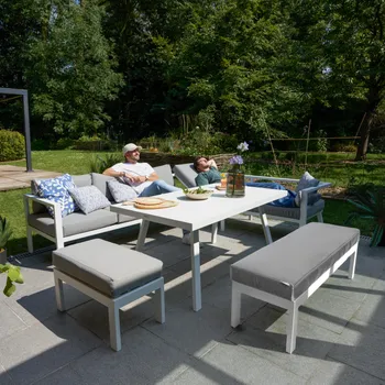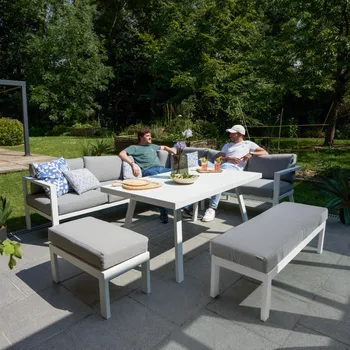 Desfrute de momentos de convívio ao ar livre com o conjunto de mobiliário de canto para jardim Naxos II.