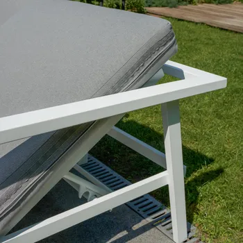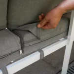 Ajustável, o ângulo pode ser posicionado para a direita ou para a esquerda dependendo da configuração do seu terraço. As almofadas traseiras são fixadas às almofadas do assento através de tiras de velcro para permanecerem no lugar em condições de vento.