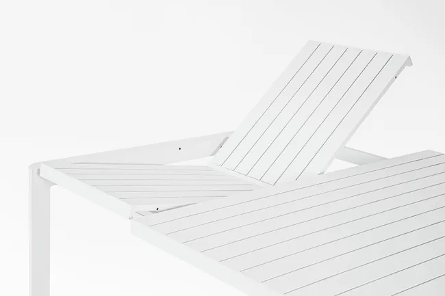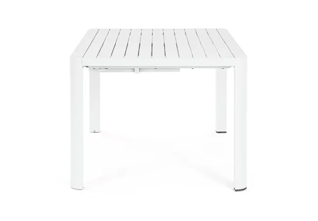 Mesa extensível “Kiplin” 149×97/149 branca em alumínio pintado para exterior em jardim e varanda